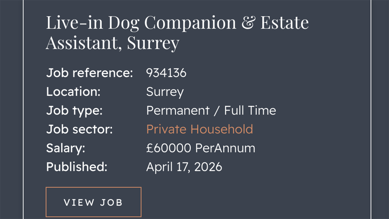 Cerchi lavoro come dog sitter? Scenario: la campagna inglese della Contea Surrey, due passi da Londra tra Kent, Sussex, Hanphshire e Berkshire. Qui per occuparsi di un cane di famiglia, dare una mano alla servitù e gettare un occhio alla sicurezza della proprietà, riceverà un compenso di 60mila sterline l'anno, pari a 68 mila 928 euro al cambio del 18 aprile.